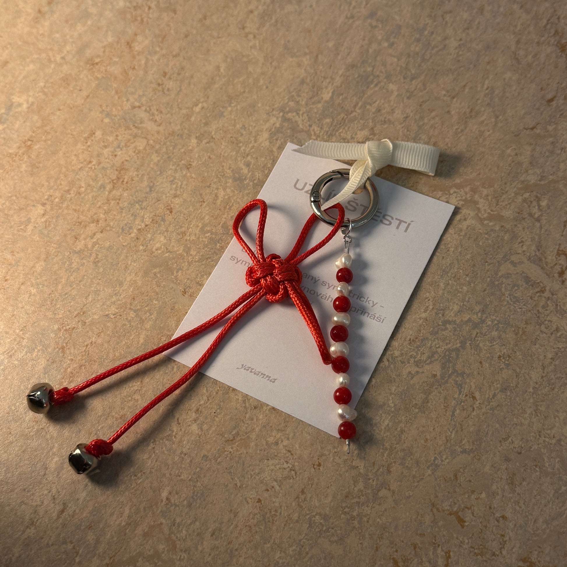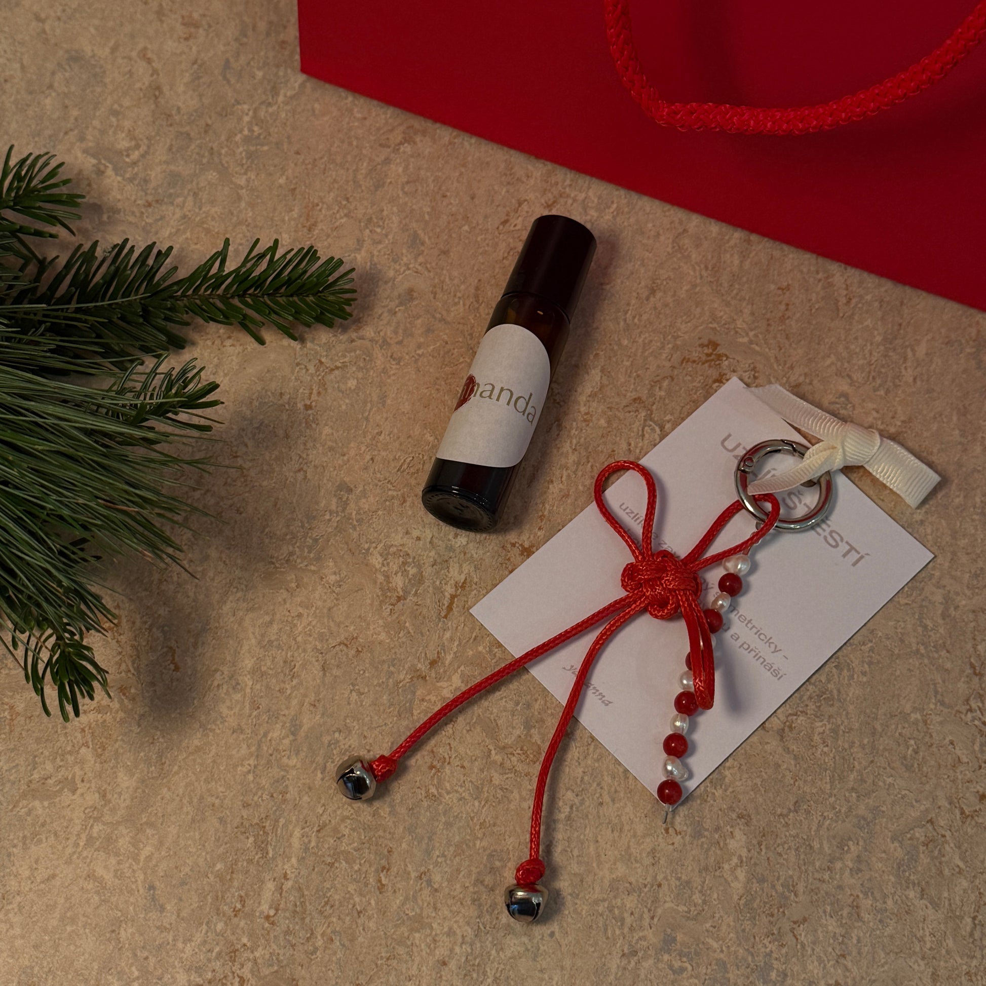 Uzlík štěstí se dá nosit jako přívěsek na klíče, kabelku, nebo jako talisman. Na uzlíku jsou použity perla & karneol. Uzlík je svázaný symetricky - přináší balanc a štěstí. Přírodní roll-on parfém je vyroben z bylinného macetátu (jojobový olej, růže, tulsi, jasmín, kontryhel a skořice) a esenciálních olejů (růže, jasmín, ylang-ylang, máta). Parfém má 10ml.