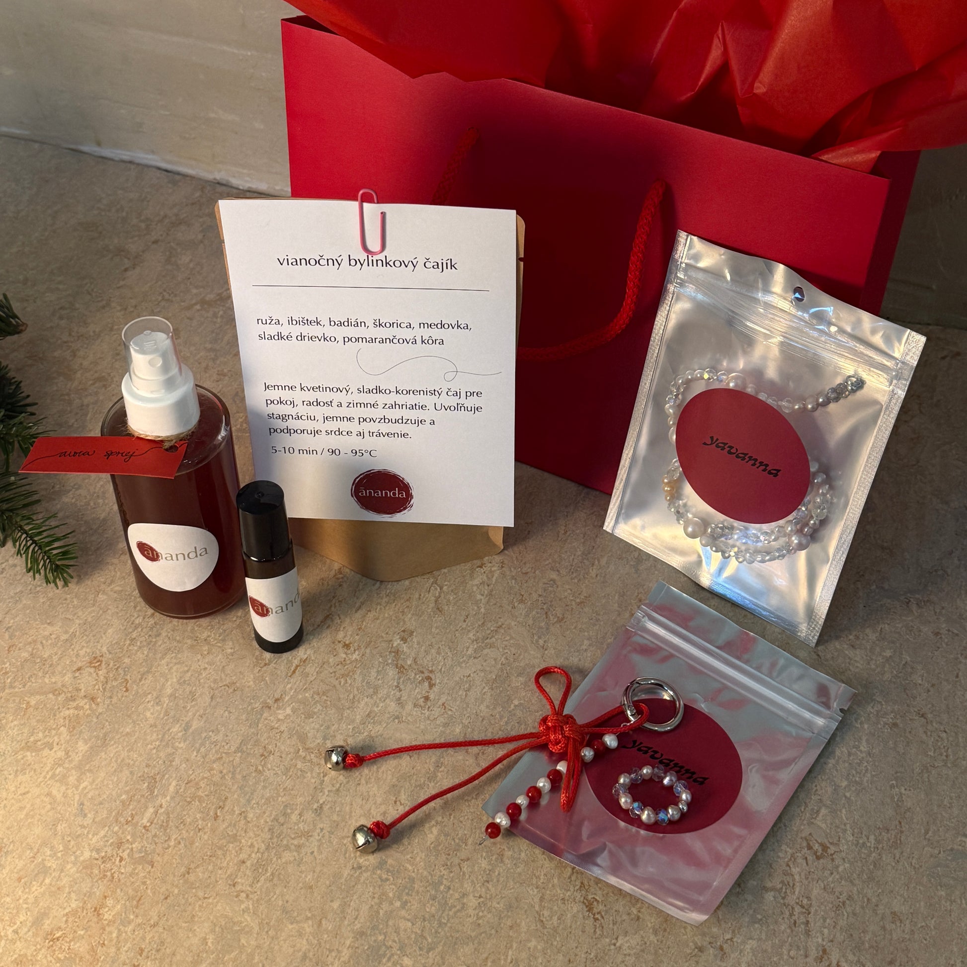 Balíček obsahuje náhrdelník a prsten z perel, uzlík štěstí z karneolu a perel, roll-on voňavku z macerátu růže, jasmínu, tulsi, skořice, kontryhelu v jojobovém oleji + esenciálních olejů růže, jasmínu ylang-ylang a máty. Aura sprej ze silného výluhu růže a esenciálních olejů indické růže, levandule a ylang-ylang (sprej se hodí na provonění prostoru, na povlečení, nebo jako lehký parfém). Bylinná čajová směs je z růže, ibišku, badyánu, skořice, meduňky, lékořice a pomerančové kůry.